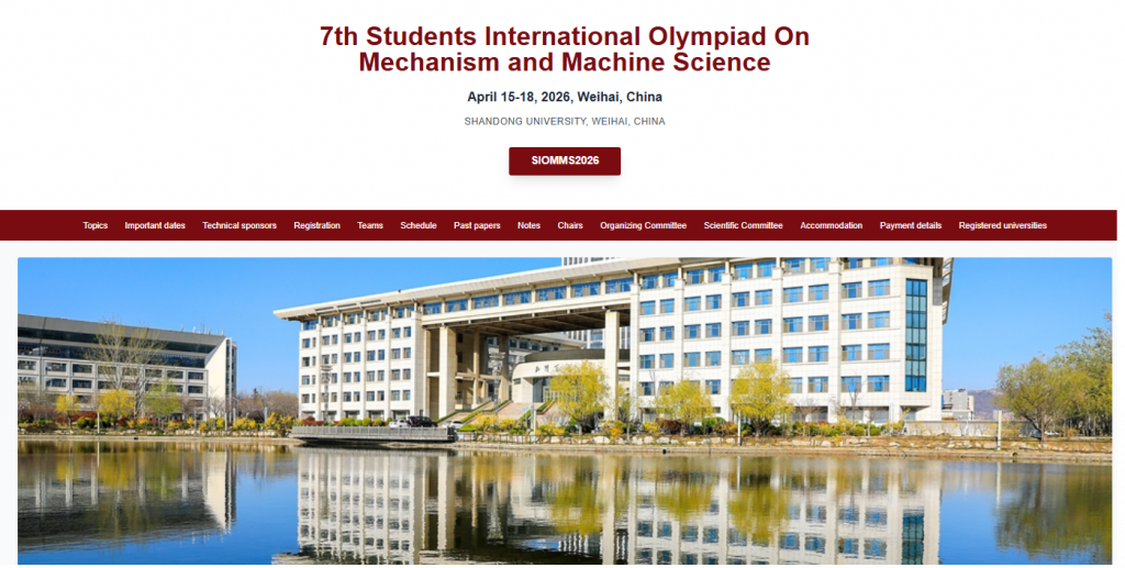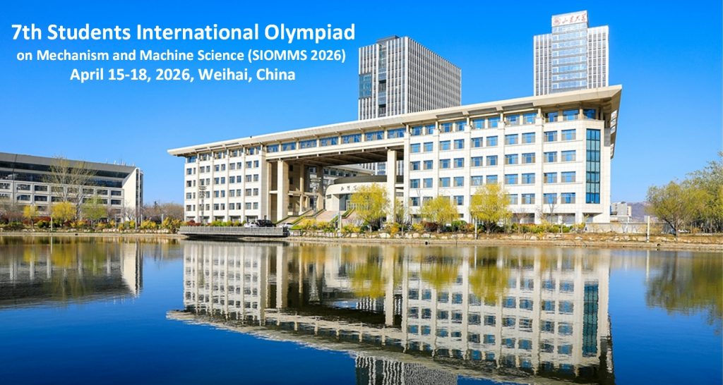 The 7th Students International Olympiad on Mechanism and Machine Science (SIOMMS) will be held from April 15 to 18, 2026 at Shandong University, Weihai, China. This edition will continue the tradition of previous Olympiads, which were successfully hosted in 2011 at Izhevsk State Technical University, Russia; in 2013 at Shanghai Jiao Tong University, China; in 2016 at Universidad Carlos III de Madrid, Spain; in 2018 at the Pontifical Catholic University of Peru in Lima, Peru; in 2022 again at Universidad Carlos III de Madrid, Spain; and in 2025 at Satbayev University, Kazakhstan.
