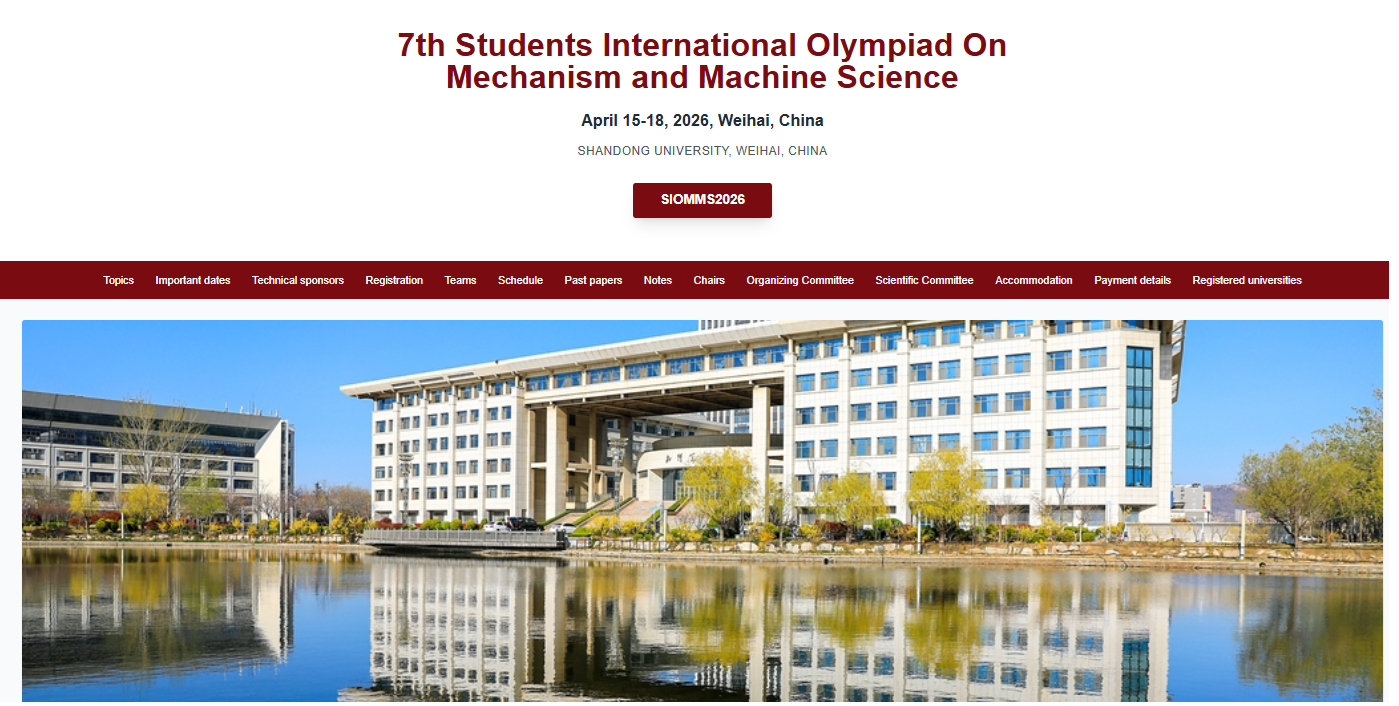 Shandong University cordially invites university teams to participate in the 7th Students International Olympiad on Mechanism and Machine Science (SIOMMS), to be held from April 15 to 18, 2026. This edition will continue the tradition of previous Olympiads, which were successfully hosted in 2011 at Izhevsk State Technical University, Russia; in 2013 at Shanghai Jiao Tong University, China; in 2016 at Universidad Carlos III de Madrid, Spain; in 2018 at the Pontifical Catholic University of Peru in Lima, Peru; in 2022 again at Universidad Carlos III de Madrid, Spain; and in 2025 at Satbayev University, Kazakhstan.